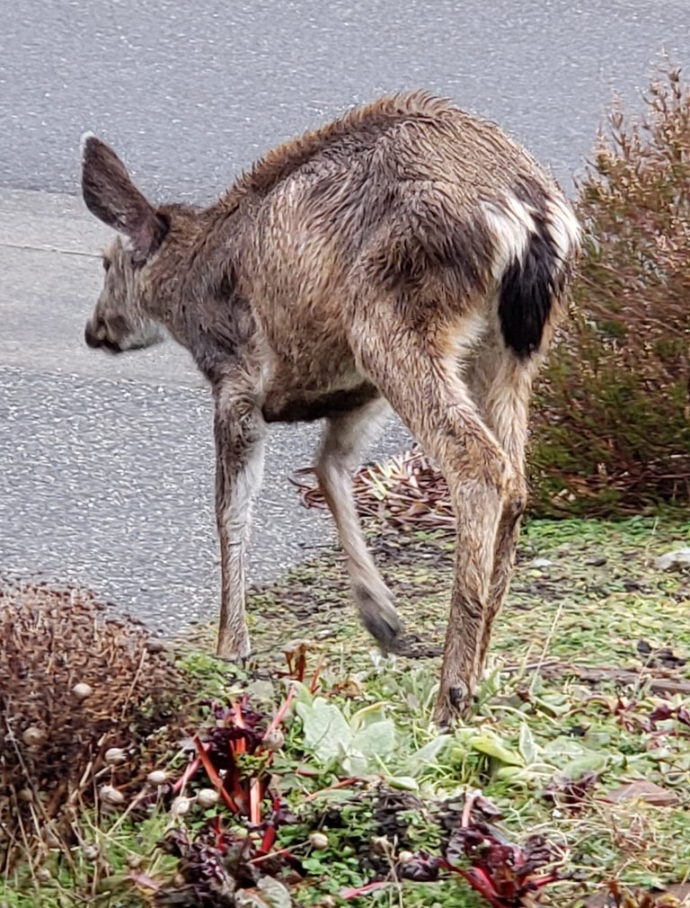 This deer was looking rather wet. I've solved the mystery of what was eating the Swiss Chard but didn't have the heart to chase the deer away.