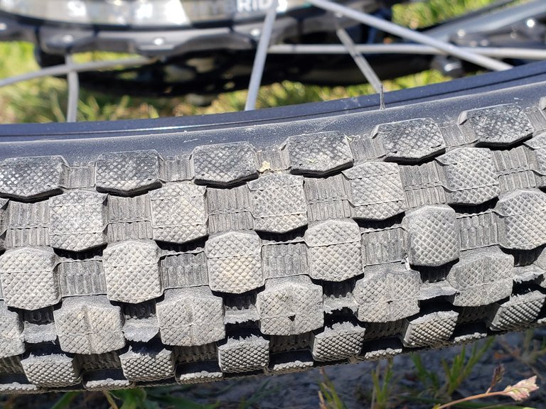 I rode on a little way and sure enough the tire was going flat. I pulled over just before a busy highway so it was really a good place to take my time and repair it. I looked at the tire really carefully and there was a small metal object in it. You can see it in this picture if you look hard enough: