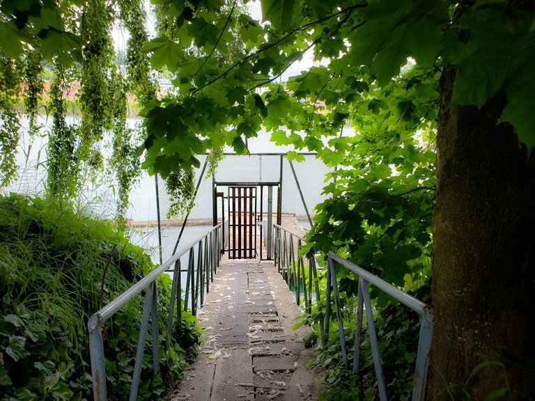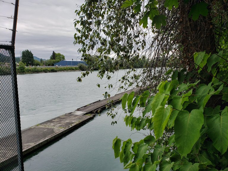 When I got to it the door was locked and there was some barbed wire over the top to prevent would be adventurers from going over it. There was a fun looking dock down by the river just beyond the door: