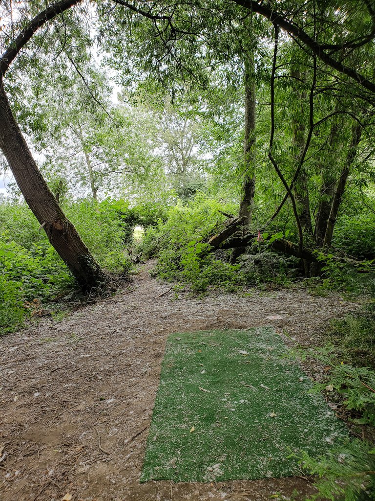 If you angle the disc just right with a stable enough disc it will travel far enough to not land in the trees or the two patches of brambles. Here's where my disc landed. This is looking back towards the tee. Too much of a fade or overpowering the disc might put it into the patches you see just to the left and right: