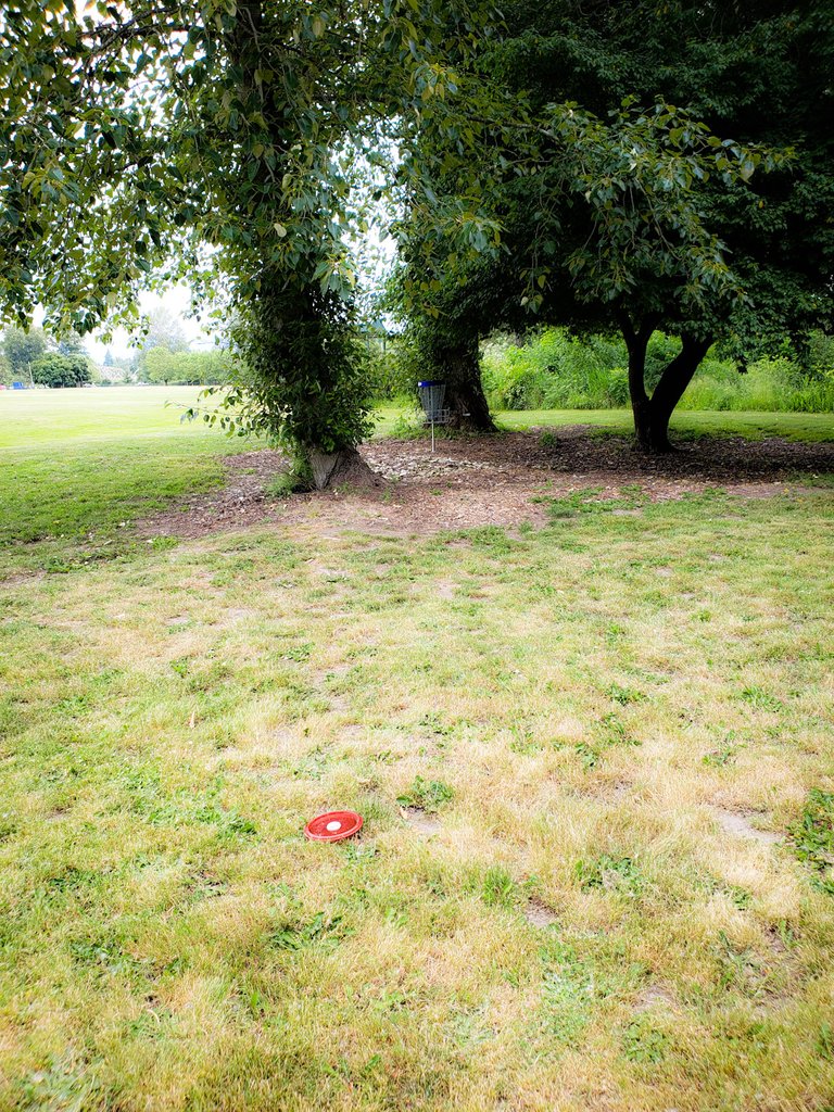 Here's a view from the tee pad on one of the baskets. Where's the basket? You might wonder. I usually walk up and look out of the small doorway like looking passage to see if anyone is in the range of the throw. Then I just throw it up throw the small break between the trees and hope it doesn't end up in the rough.