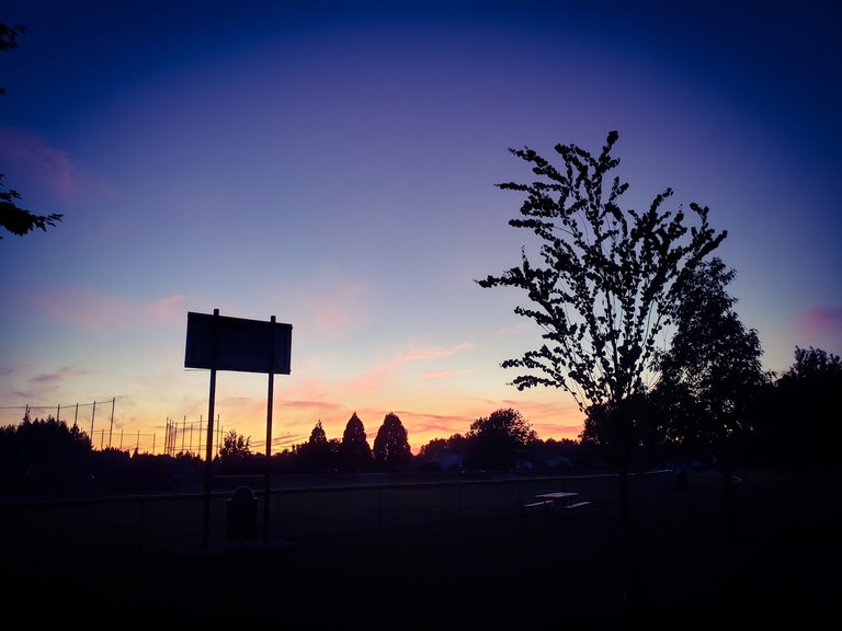 Sunset with ball park sign in foreground, getting brighter and more colorful:
