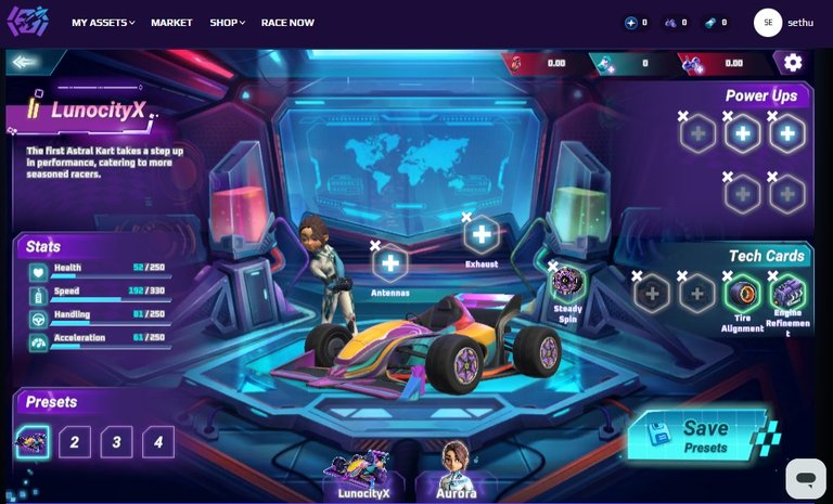 I still have a few more parts to install on my racing car. I still have Antennas, Exhaust, Power Ups, and some Tech Cards to install. I'll install them later. I've installed five cards now. I installed LUNOCITYX, Aurora Driver, Engine Repair, TITRE ALIGNMENT, and Steady Spin. With these, I can compete.