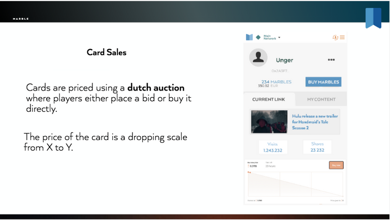 No two MarbleCards are the same, as each one has its own unique pattern that is generated from the content that is available on the URL at the time that it is created. The possibilities are endless, as these MarbleCards can either be of value to you, or be worth a lot to many others. The sales process is structured like a Dutch auction, and the one who started the auction will received a share of that sale. The other share is given to owners of the highest ranking cards.