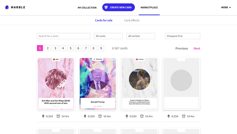 MarbleCards enables their users to preserve their digital memories as crypto collectibles. Anything that has its own respective URL is eligible to become essentially marbled into a collectible card. MarbleCards is based on the ERC721 protocol and each URL can only go through this process once. When you take ownership of the card, then it is yours to do whatever you want with it, such as sharing, trading, and saving.