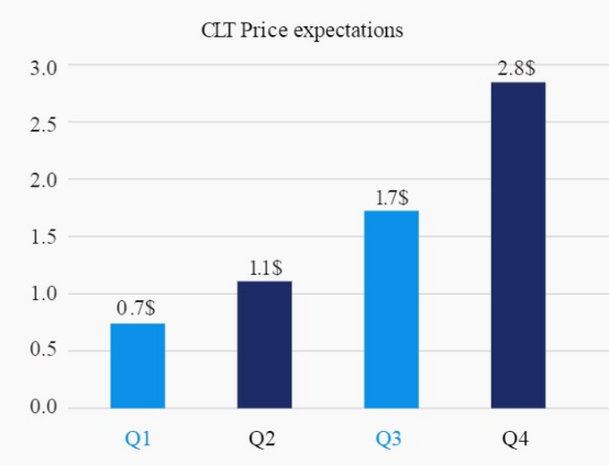 It is expected that by the end of the year will be distributed 60,000,000. A sale is offered in two rounds based on a well-studied percentage for each round. From this, we will be able to develop an estimated CLT price and forecasts for 2018. Based on the forecasts of our participants, by the 1st quarter the forecasted market for CLT is fixed at the level of 0.7 $. The CLT price will continue to grow in various proportions, from $ 1.1 in Q2, to $ 1.7 in Q3. In the fourth quarter, the CLT price is projected to grow to $ 2.8. We calculated the CLT price forecast, using the number of tokens expected to be distributed by the end of the year and the forecast of our participants by the value of the coin by the end of the year.