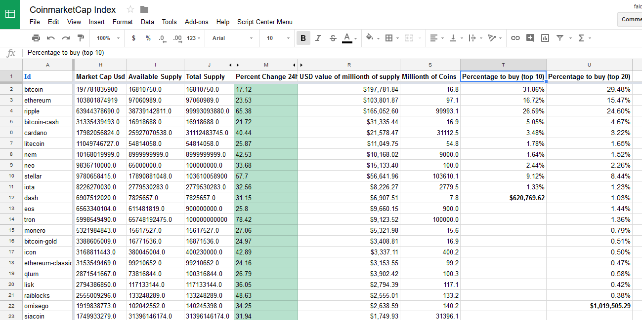 In columns T and U of the spreadsheet you'll find the percentage of funds you should invest based on market cap and the USD value of the millionth of supply of the coin. This is calculated by dividing the USD value of the millionth of supply by the total amount you should invest to own the top 10 or 20 coins.
