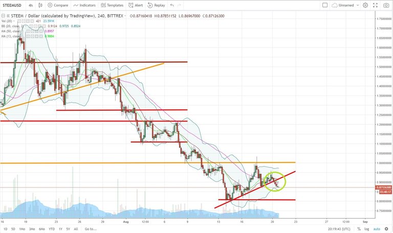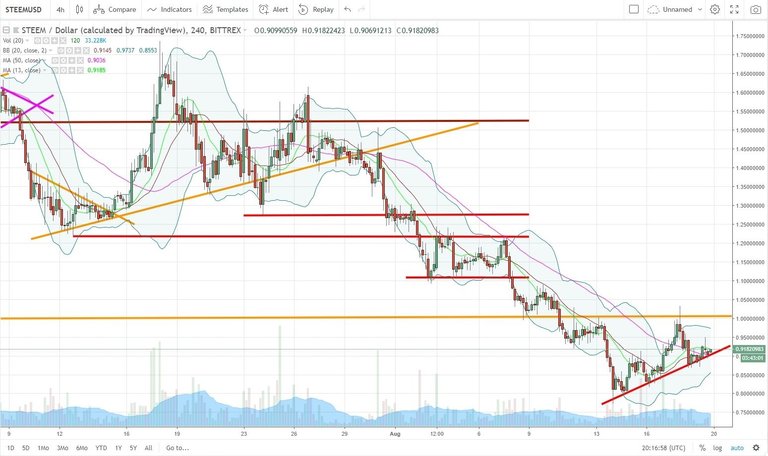 We broke the support line in red some hours ago. I was hoping that this support line in red would have helped us to go test the resistance line in orange but this support line was not strong enough... So now we are having a new drop on the STEEM which could make us test the support line in red around 0.80$.