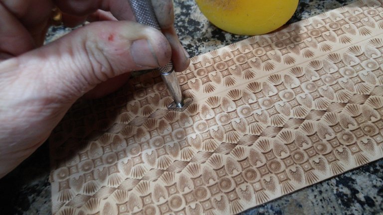 I bring my own twist to this decorative art, creating complex patterns that blanket a piece of leather, creating rhythm that "buzzes your eyes" and at the same time soothes with its color gradation.