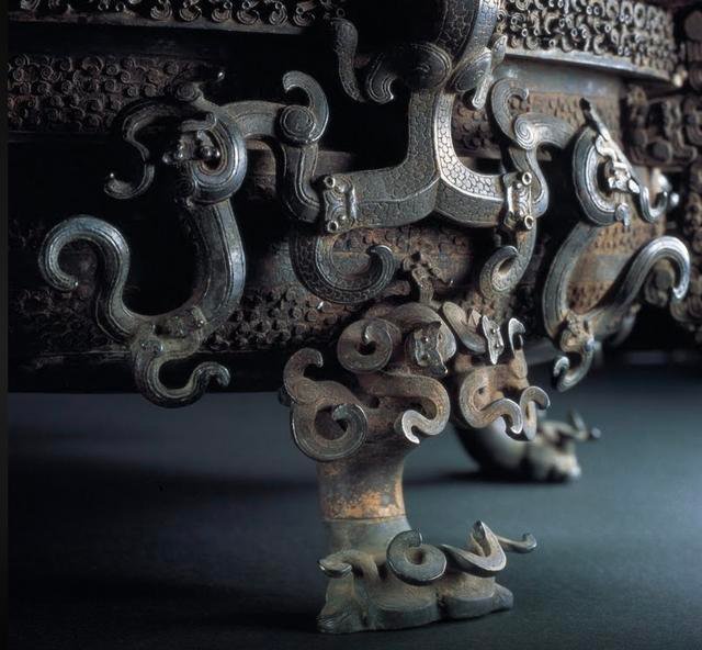 “虺”(huǐ)是古代汉族传说中的一种龙,生活在水中,它们在尊盘上形成华丽的镂空蟠虺纹。这些虺是采用失蜡法熔模铸造。