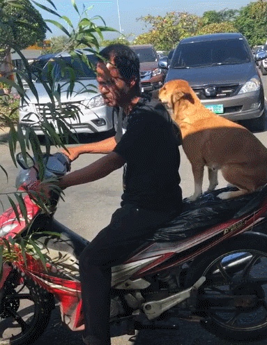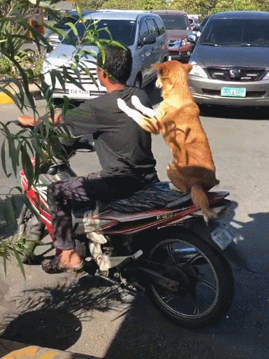 宠物狗主人:上来,摩托车带你去兜风……狗:小问题,看我矫健身姿,完美落地,啊,不对,看我完美落摩托。
