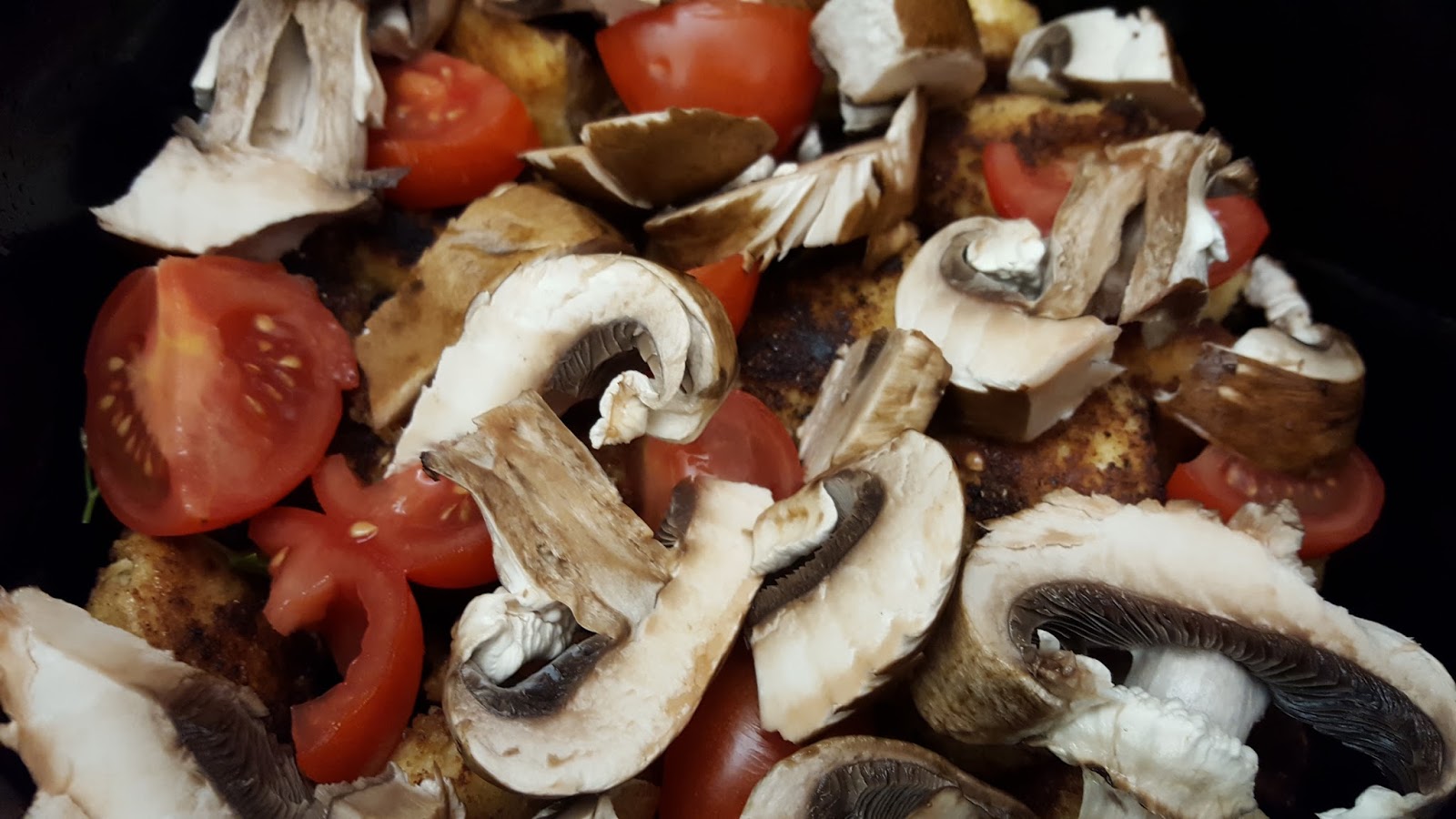 I want to circle back around and talk about the jar o' sauce for a moment. I get it, jarred sauce is not the number one choice. I know, SUGAR, SUGAR, SUGAR! But it's ok. Cooking with a jar of pasta sauce every now and a gain is fine. I decided to use something quick that I had on hand, however I would like to suggest for others that you can add fresh tomatoes and other vegetables to add more flavor and another very easy option is to use a carton of tomato puree. If you are already adding herbs, that will be enough flavor. The slow cooking will cook down the tomatoes and make them a well blended part of the sauce. That's what I did on my second go around (I had gloated about how good this came out and then turned around and ate the whole damn thing, so sharing meant a redo was in store). Portobellini mushrooms and fresh tomatoes went on top along of some chicken cut into smaller bits with tomato puree and herbs. The choice is yours on the jar dilemma; crock pots allow you to get that melding of flavors you would normally get simmering pasta sauce on the stove top, so have some fun and make the sauce your own.
