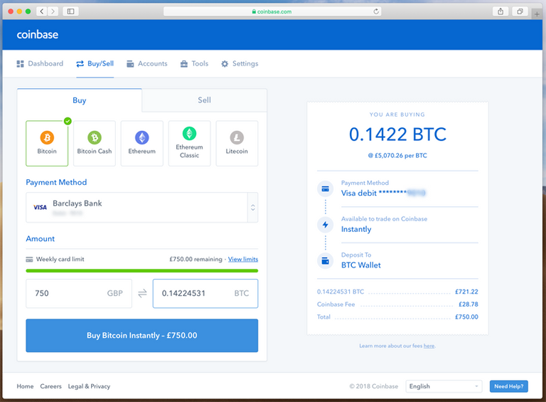 - Once you're happy with this, click the buy button and the bitcoin will be sent to your Coinbase wallet.