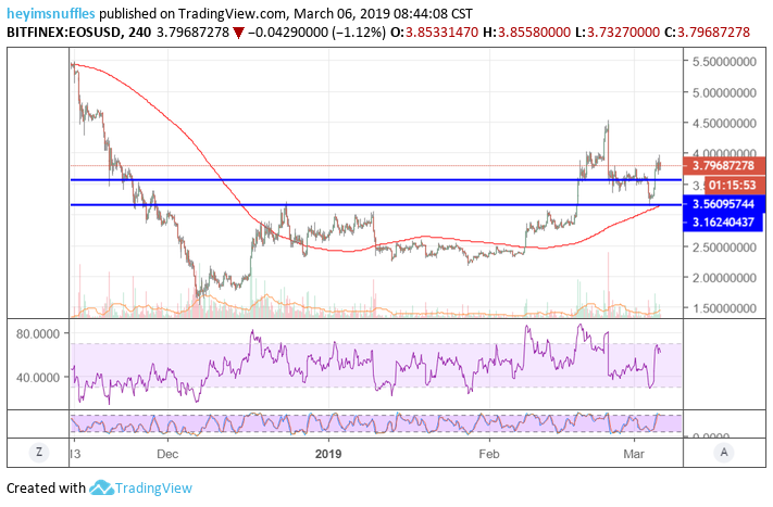 You can see the spike and puke on an intermediate timeframe and watch how the asset goes sideways from that point. Then you have the shakeout that all of crypto had that I called a week ago and now we have grinded higher. AS LONG AS WE STAY ABOVE 3.55...we are on the way up. Zooming out a tad you can see that major intermediate support on a 4 hour time frame is below around 3.15.