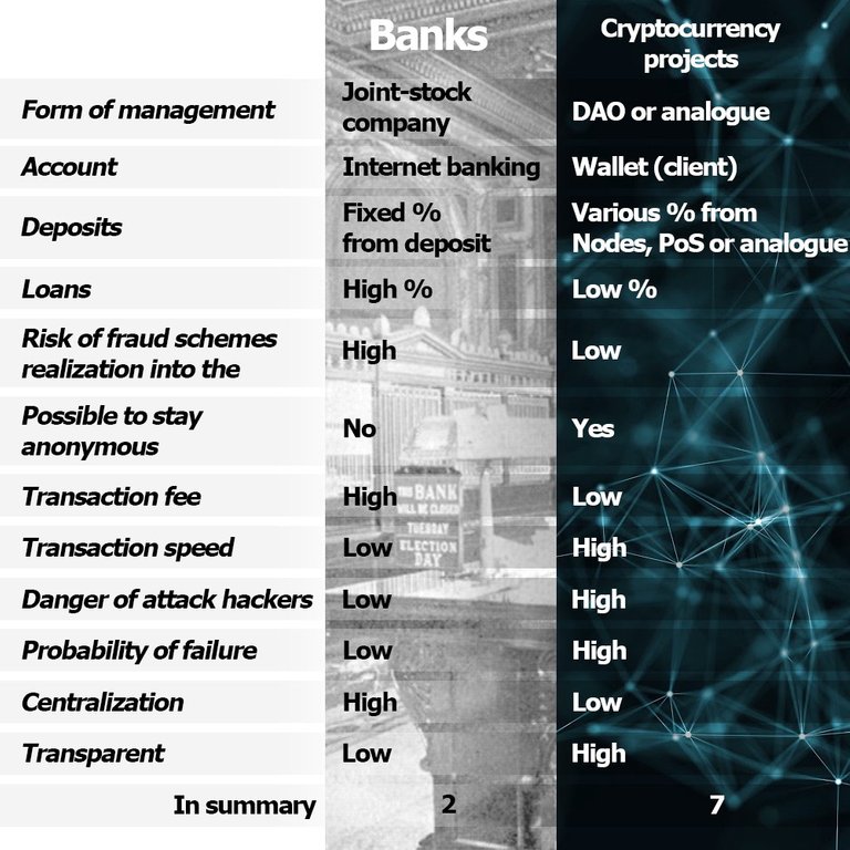 Hi, guys. In last article I told how it is possible to do money using cryptocurrency. Now I offer to reason a little and immerse yourself into utopian future when the cryptocurrency will be instead of banks.