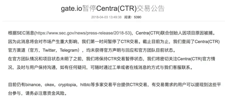 受该消息影响,CTR暴跌60%,币价创历史新低。币安、gate.io、okex、kucoin等交易所发布公告,提醒用户注意风险。币安、kucoin表示不排除会下架CTR交易对。