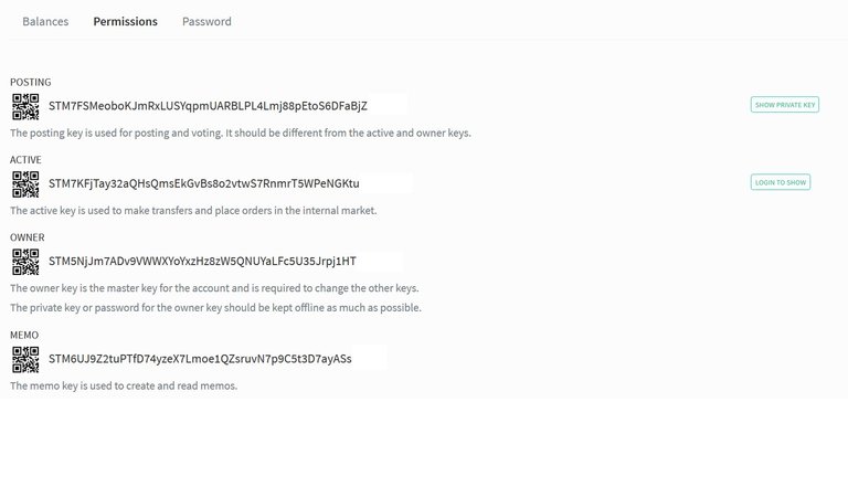 Um euren "posting" Key sehen zu können müßt ihr rechts auf "show private Key" klicken und für den "active" Key auf "Login to show", ansonsten stehen sie in verschlüsselter Form da!