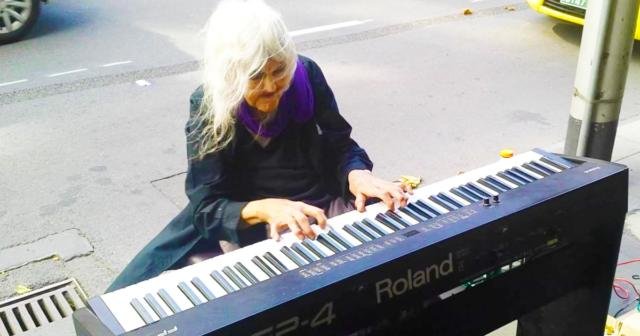 She sits down in her shabby overcoat and… starts playing the piano. However, it certainly isn’t just a bit of piano chopsticks! She transforms her sidewalk performance into a beautiful recital, a recital that we would pay good money to see again in a concert hall!