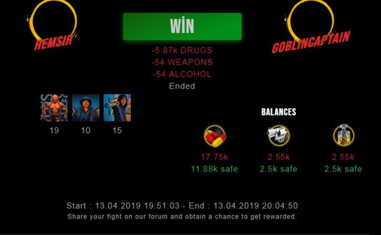 Check my latest fight ! hemsir vs goblincaptainhemsir (35)in #drugwars-fight • 7 years ago #gaming #fight #dw