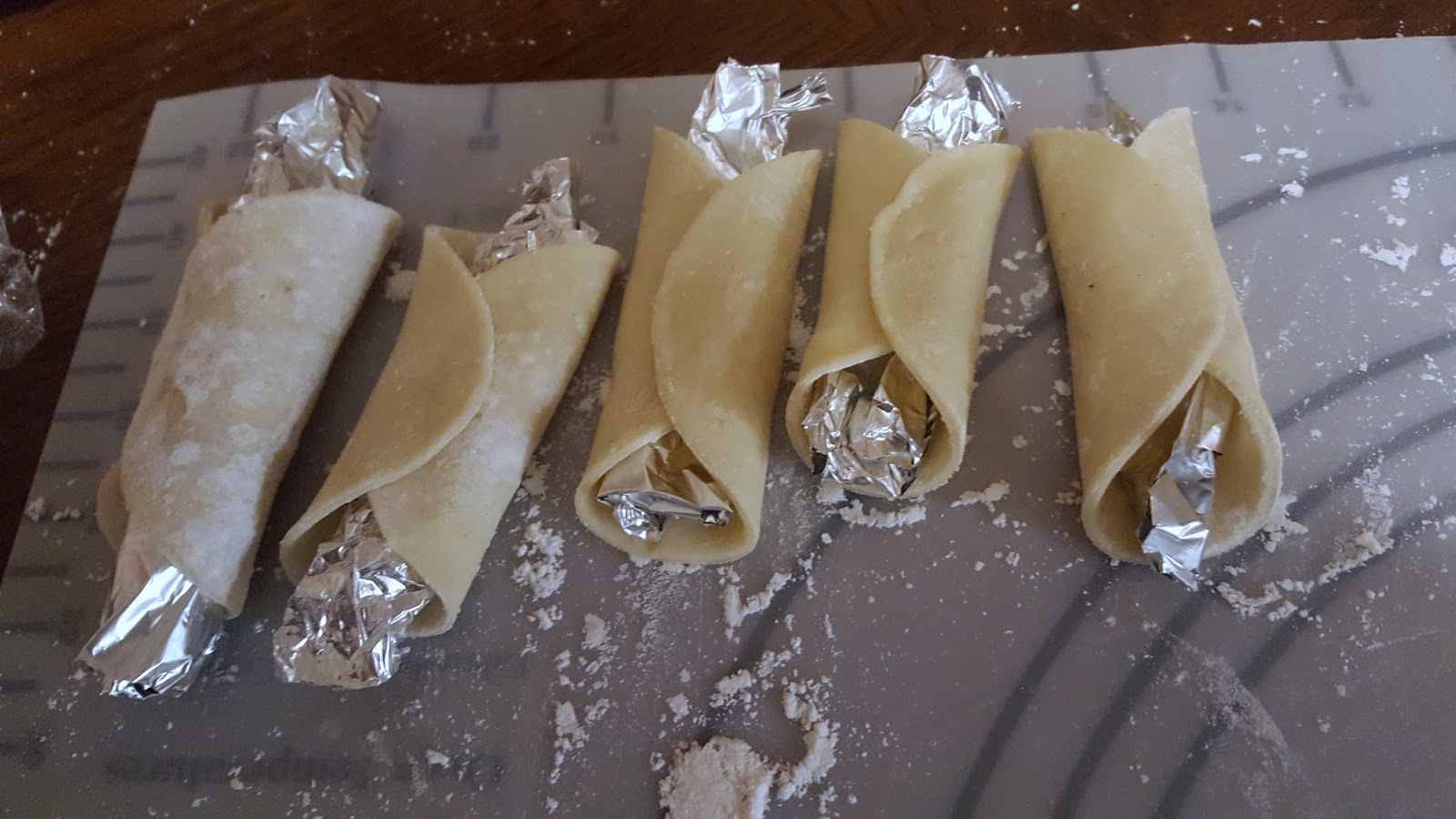 The dough was then wrapped around some curled up pieces of foil to keep them from flattening out, and a bit of that leftover egg white was used as glue to seal the edges shut.