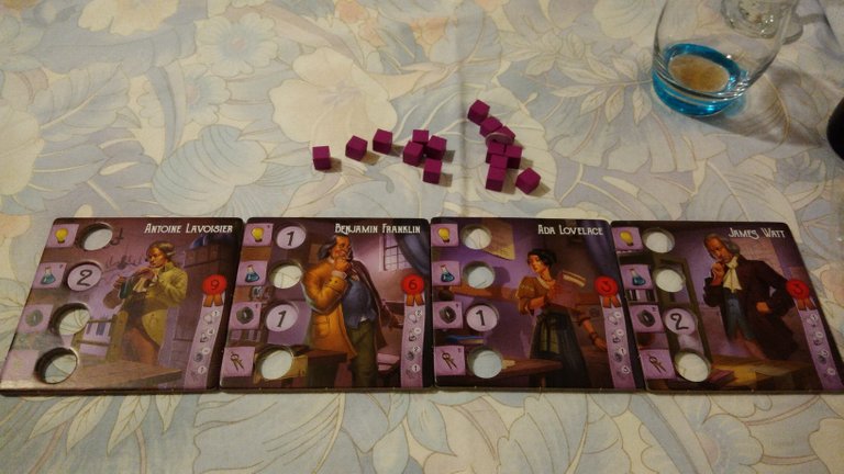 Les cartes sur la table font apparaître plusieurs symboles des ces différentes capacités. Pour valider une invention, il faut que chaque symbole est reçu un cube. Plus on avance dans les âges, plus il faudra remplir de cases chimie, physique, mécanique et/ou mathématiques.