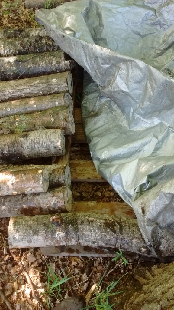 Under the tarp is a upside down pallet and logs laying around the perimeter.