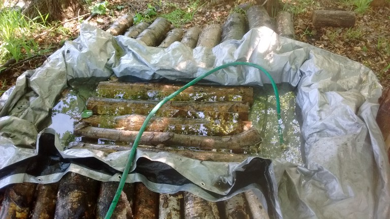 I am soaking my mushroom logs in order to help hydrate them and encourage them to fruit. I made a ‘tarp pool’ to hold the water around the logs.