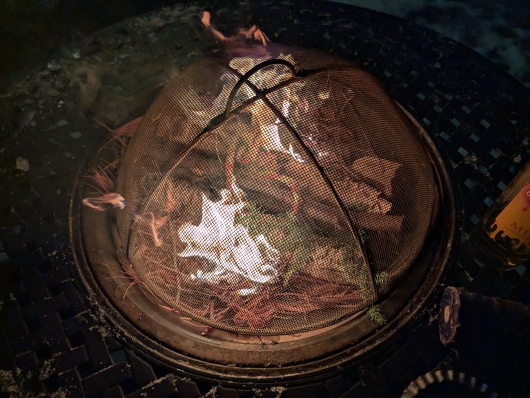 Stump from last year's Yule tree is in the fire. The ashes are saved to use for protection and luck through the year.