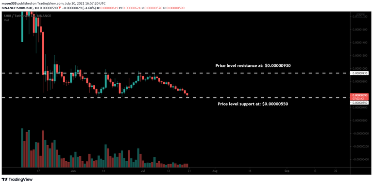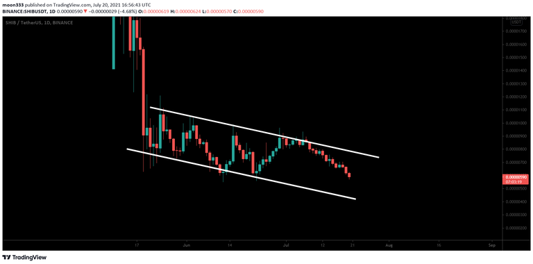 Since June 2021 the price action of Shiba Inu is moving in a down channel. During the recent drop, the priceline is moving down to test the support of this down channel once again. Previously the priceline has tested the support several times.
