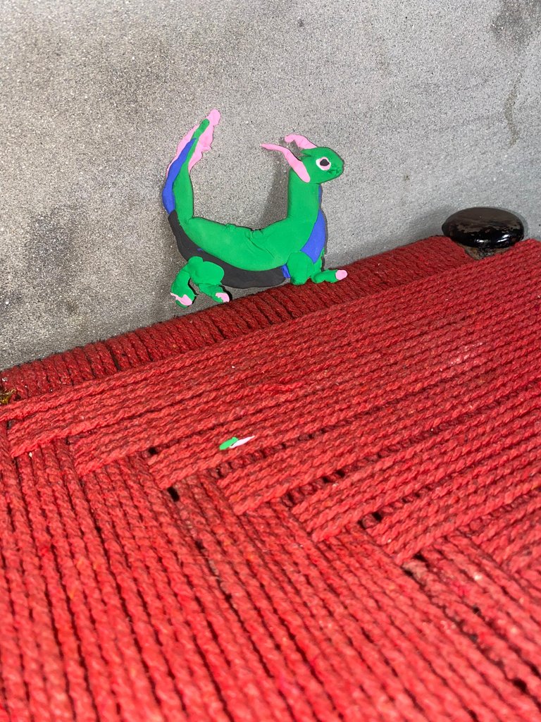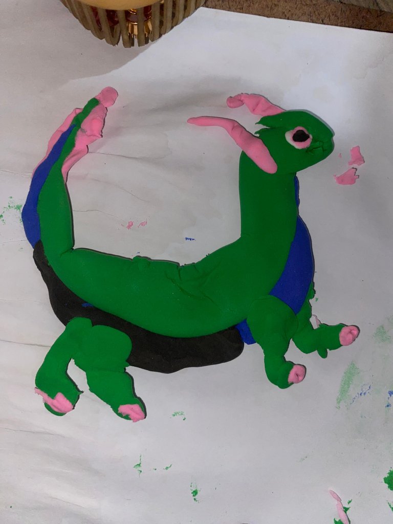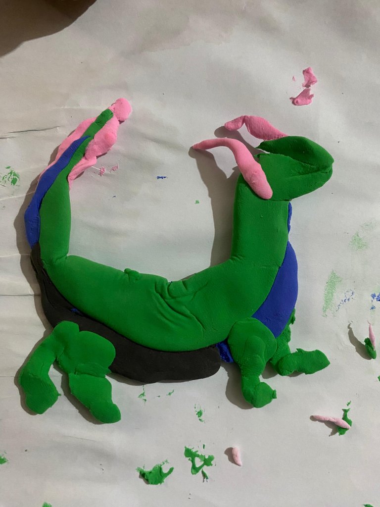 Now in fourth step, I used green clay again to make its legs and feet. It was too hot today so the clay was melting. And it was very hard to handle it. So I make it hard first by my palm and then make it for th third time and here it was.