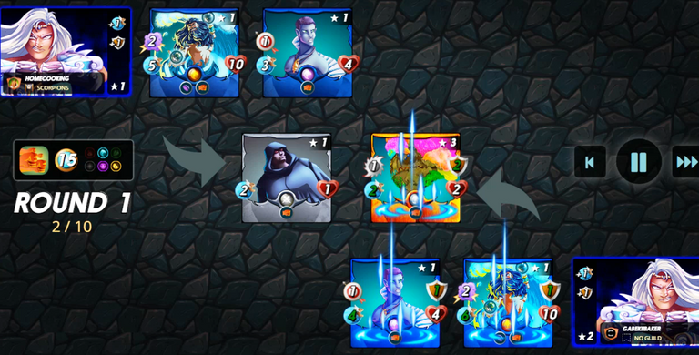 On 2nd position I used DJINN OSHANNUS LEGENDARY Water Unit with 2 magic attack, 10 health and 5 speed with void ability. This is my main attacking card in this battle.