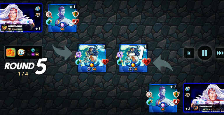 On 3rd position I used IGOR DARKSPEAR EPIC Water Unit with 1 ranged attack, 4 health and 3 speed. This card is very helpful in low mana battels with only 2 mana.