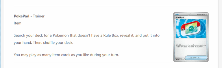 Here is Pokepad once again. You can search for a non Rule box Pokemon that is a Basic or Evolution from your deck and put it into your hand.