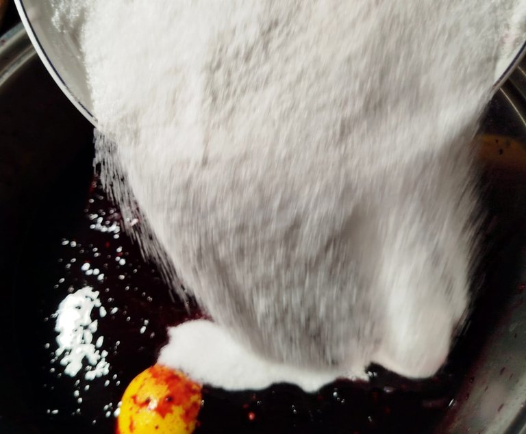 Pour 2 kg of sugar over the top, but do not stir. Leave undisturbed for the first 1 day.