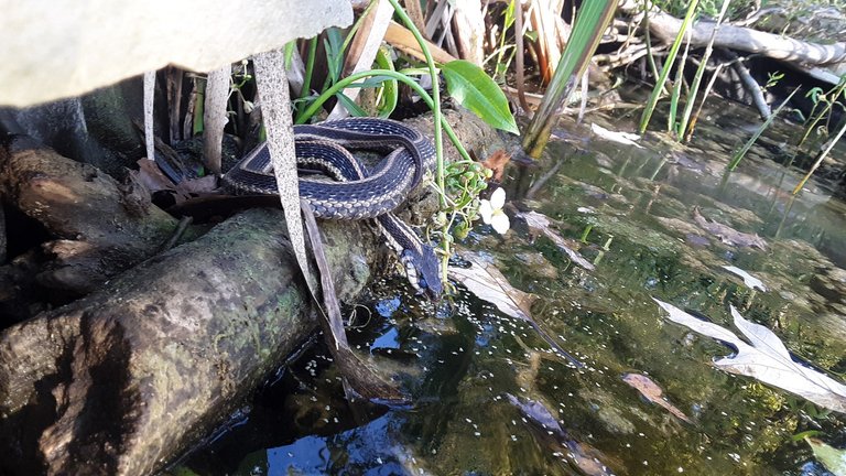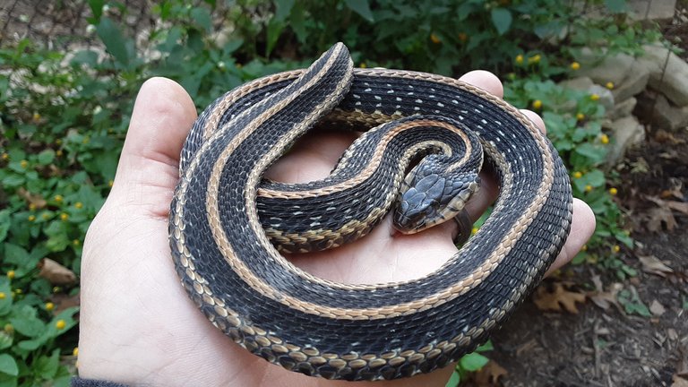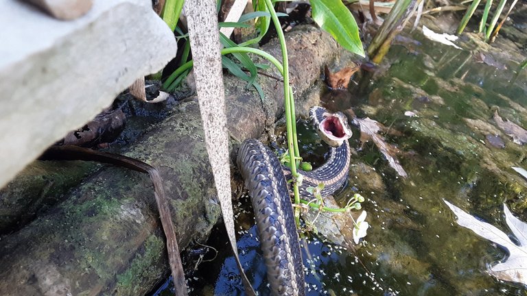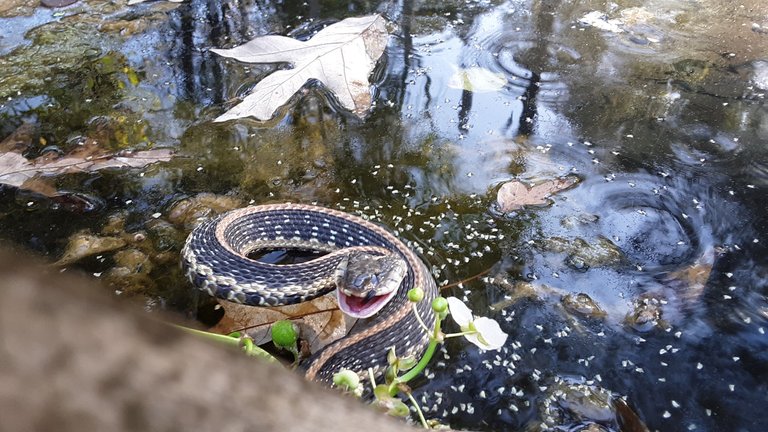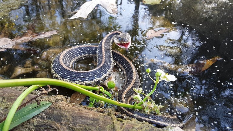 Here's some photos of a Garter Snake in my hand, and in my pond. It was a rather defensive one, mostly because it was "in the blue," which means that it's eyes are glossed over and it is preparing to shed. At that point, it mostly sees shadows, so the world is a lot more intimidating to it. I just took some quick photos and let it go back in the pond. It may eat some little frogs or fish, but such is the food chain. Enjoy the photos.