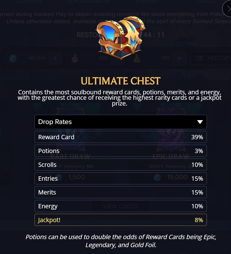 Each of the chests could contain Reward Card, Potions, Scrolls, Entries, Merits, Energy or Jackpot. Here are the drop rates for the Ultimate Chest. The Minor and Major Chests have lower drop rates for the higher level rewards so it will be based on your luck of the drop rates which reward you finally end up with.