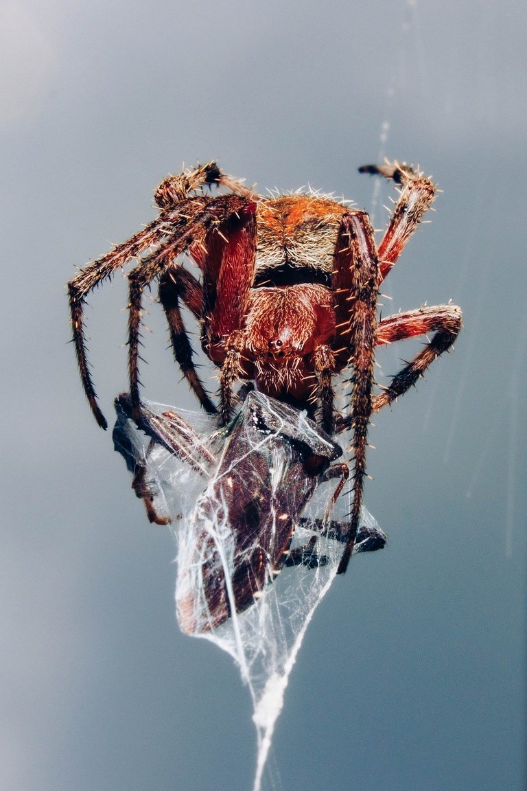 Una araña marrón, siempre había pensado que eran de color negro, se balancea sobre su tela para disponerse a envolver su comida. Quizás recibió un delevery o la tenía almacenada, lo cierto es que ya tiene su comida asegurada. Sus patas están llenas de pequeñas púas o setas, muchos pensaran que son para sujetarse del hilo o para usarlas de forma defensiva e inmovilizar a sus presas. Pero son parte de su sistema sensorial. Cada una de estas setas pueden sentir las vibraciones de los hilos de la telaraña y así detectar que el almuerzo a llegado.