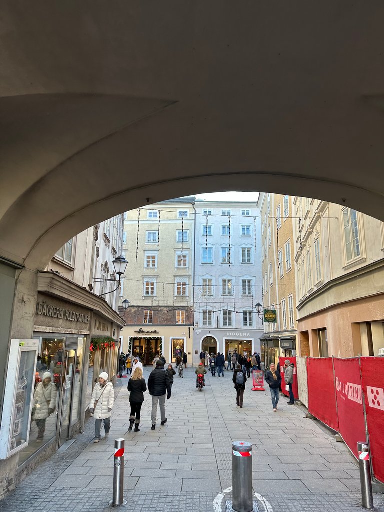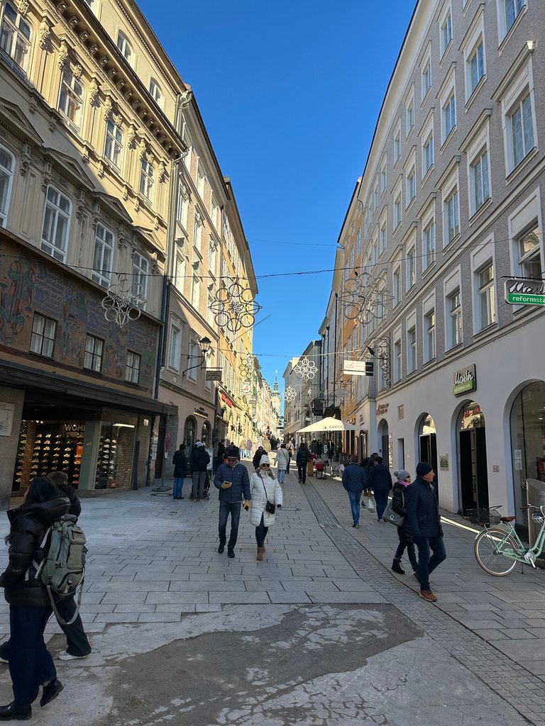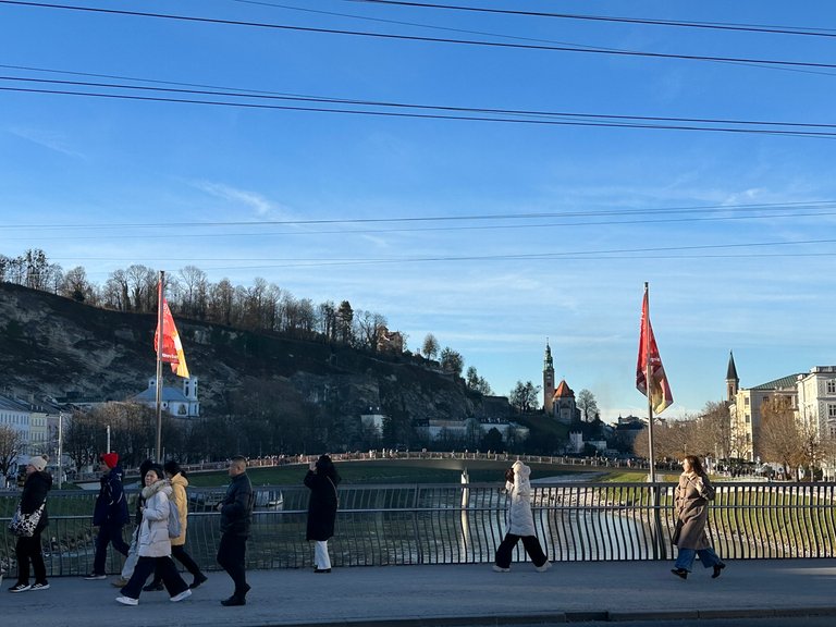 We crossed the Salzach, the river that flows through Salzburg, via a bridge adorned with fluttering Austrian flags. The first snow of the week still lingered on the slopes surrounding the city. Crossing the bridge, we immediately found ourselves in Salzburg's Old Town and strolled along the Getreidegasse, arguably the city's most famous historic street. The tall, narrow rows of houses, adorned with numerous wrought-iron guild signs above the old shops, along with the diverse passageways and courtyards, created a cohesive picture of a medieval street. Here we also found Mozart's birthplace, where tourists were thronging to take photos.