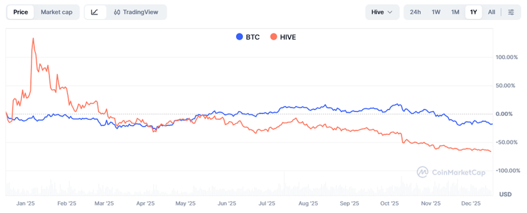 Lets look at Hive vs Bitcoin over the last year.