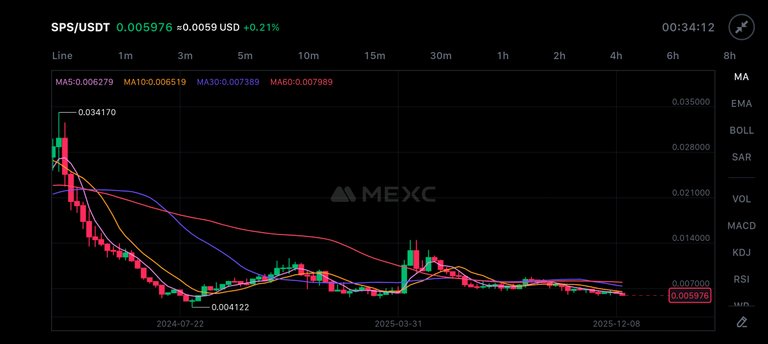 Let's talk about $SPS first. If you look at the screenshots, you will see that SPS is actually taking a 'test of patience' right now. It has now come very close to the ground after falling from that high of 0.0340. It is currently hovering around 0.0059. I looked at the 12-hour chart for a long time; the moving averages (MA) there have almost come to a standstill. In trading terms, it is now in a complete consolidation phase.