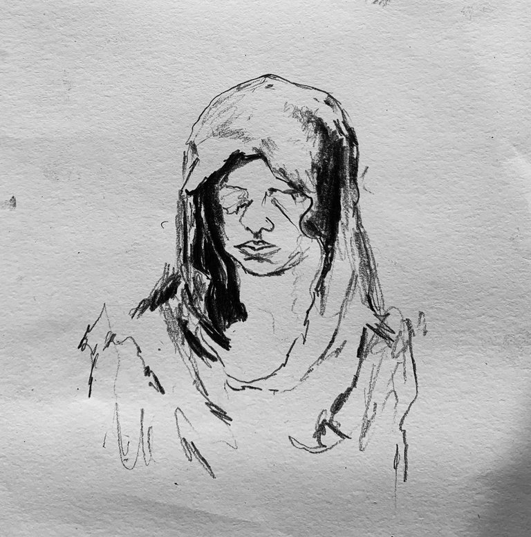 Quick one, let me share my art with you, this charcoal portrait capture a contemplative figure shrouded in shadow, her features obscured by the fold of her headscarf.