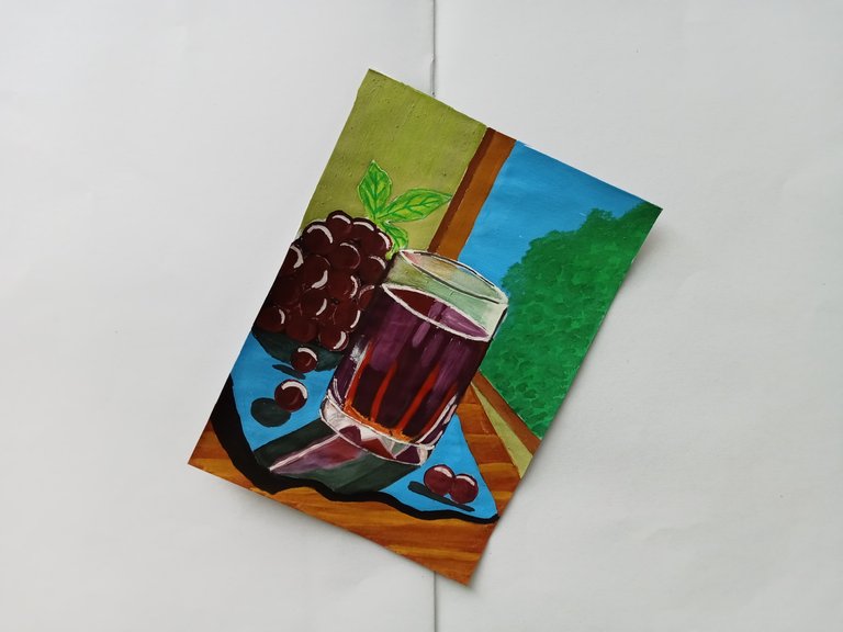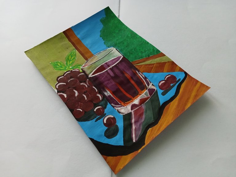 I paint the grapes with a combination of red and purple colors. I also add white color on them. I paint the glass bottom mat with blue color and I draw the shadow of it with black color.