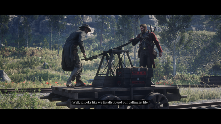 I jumped in to help him out. The loaded the crates onto a small rail carrier. While they worked, Arthur started talking to John about the future. He told John he should leave this life behind and take his family somewhere safe to start over. It was a serious moment between them while they prepped for a big blast.