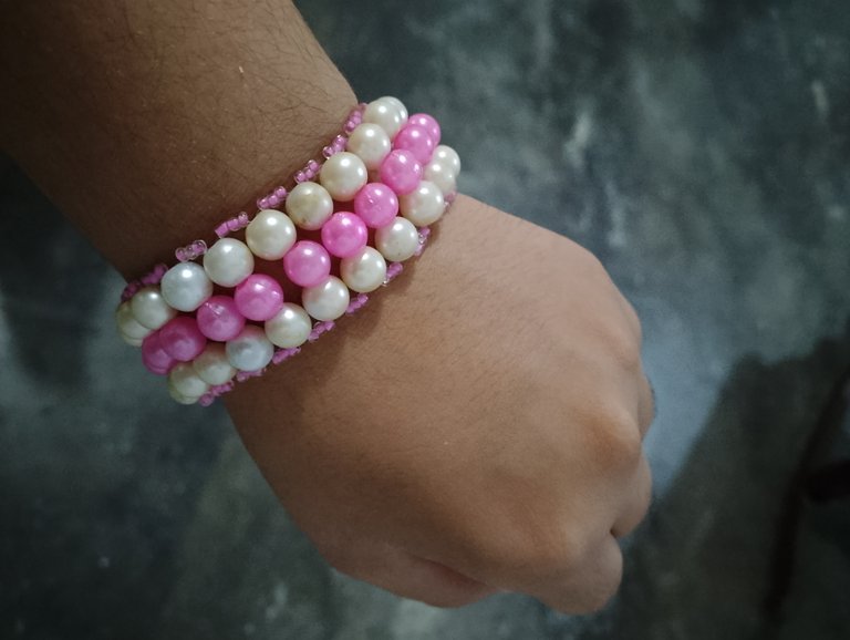 Hello dear friends at Hive and this wonderful DIYHub community, I hope you are well and have had a great day. Today I want to share with you how I made this new and simple bracelet with white and pink pearls and pink beads. What I like about this bracelet is that it is very easy to make. In terms of time, I must say that even though the steps are very easy, it takes a long time to finish because you have to repeat a step many times to complete the length of the bracelet. I finished making this bracelet in an hour. The steps are very easy to follow and are repetitive to complete the length of the bracelet. I must say that this is a bracelet that can be worn on any occasion and is easy to combine with our everyday clothing. I particularly love it because of its size and colors.