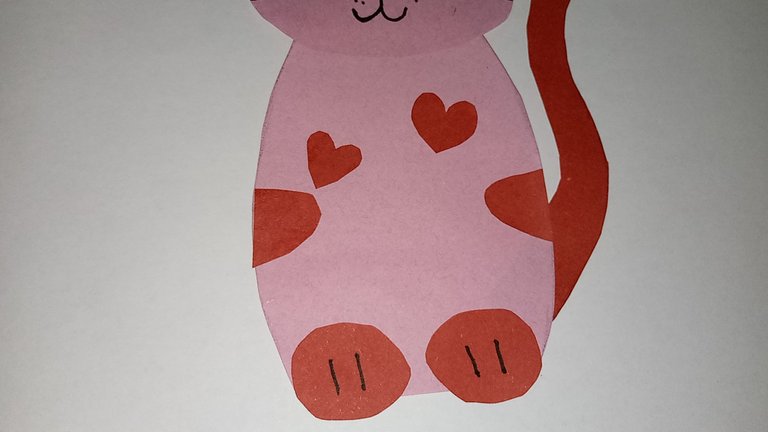 After cutting all shapes, I started attaching them with glue. First, I attached the body and the face of cat with glue. Then, I attached the legs and other shapes on it. After that,I attached the red triangles on pink ones and attached them on the face of cat to nake its ears. i also attached its tail. Lastly, I attached the white circle as eyes and red heart as nose on its face.