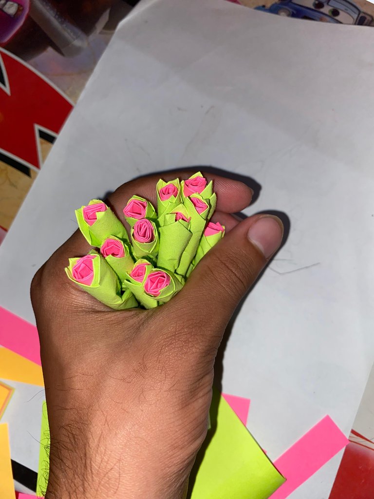 Now I take the green made part and put it on the pink flower. I folded it in round shape and then curved it from the bottom. I pinched it and it was complete.