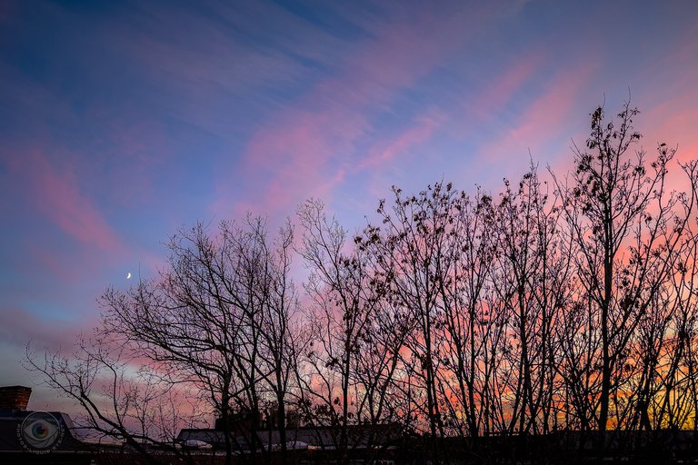 A cold and windy November morning carried a quiet kind of charm as I crawled out of bed and refused to rush into the day. The chill reached for my bones like an unwelcome guest tapping at the door, so I settled for a short Three-Bridges-Walk before grabbing groceries. I did not chase pictures and I did not feel the spark for creativity this morning. Instead I watched the sky later paint its own story. A colorful sunset curled above my roof with the silver sickle of the moon resting beside it, like a calm companion reminding me that slow moments still mattered.