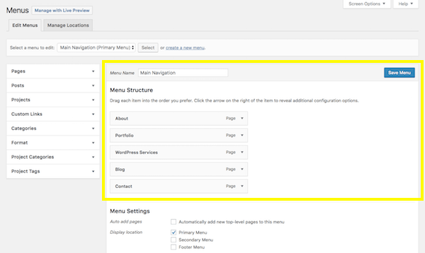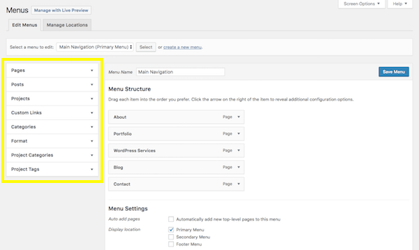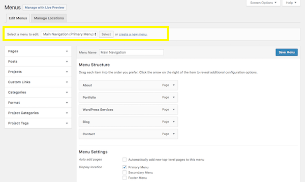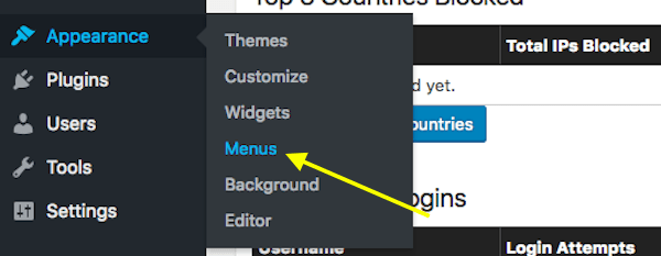 Next, you’ll want to go to the Appearance tab and select “Menus”. This is where you will build and manage your site’s navigation.