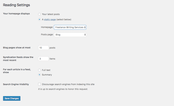 - A static page: If you select this second option, you’ll need to designate a page to be your homepage and a page to automatically display your posts on.