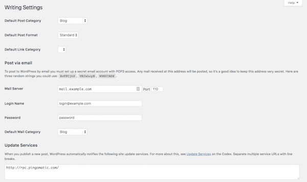 - Post via email: If you want to be able to write WordPress posts and email them to your site (which I wouldn’t advise), you can enable this setting here.